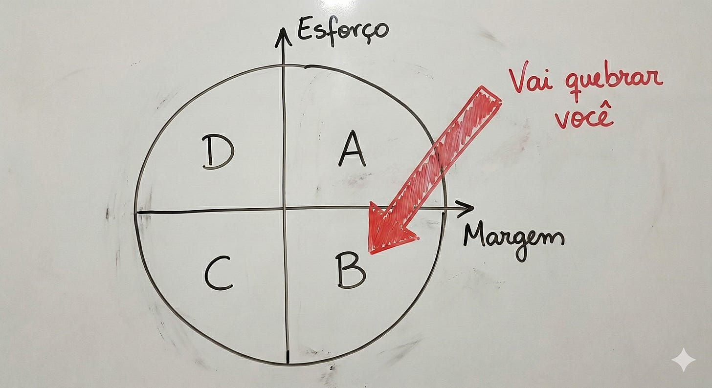 Esta é a bússola do seu portfólio: a Matriz Esforço/Margem. É aqui que o jogo de gente grande é definido.