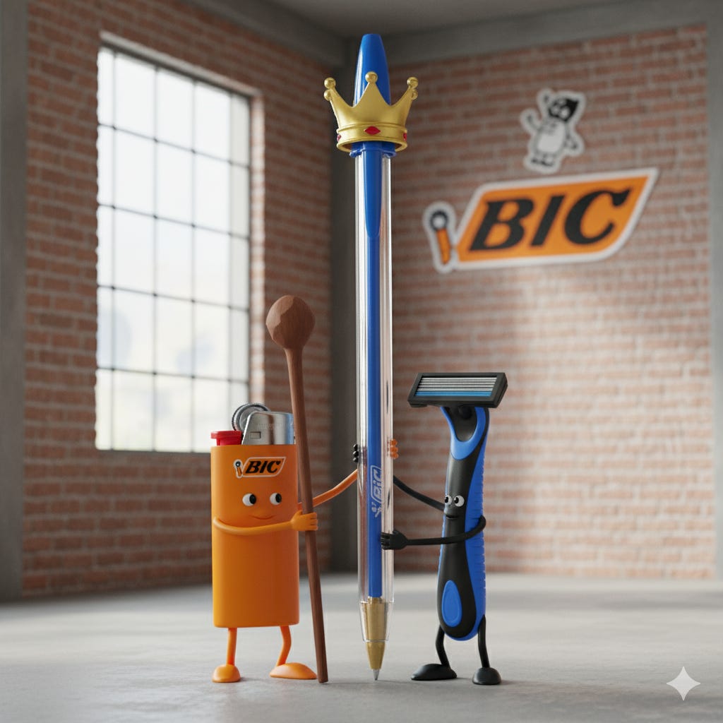 Christopher, análise cirúrgica. Confesso que não fazia ideia dessa distribuição de receita da BIC. A simetria entre Human Expression (37%) e Flame for Life (37%) não é coincidência, é estratégia de balanceamento. A BIC não diversificou aleatoriamente: canetas, isqueiros e lâminas compartilham o mesmo DNA (descartáveis, uso cotidiano, alta recompra). Mesma competência core em formatos diferentes.